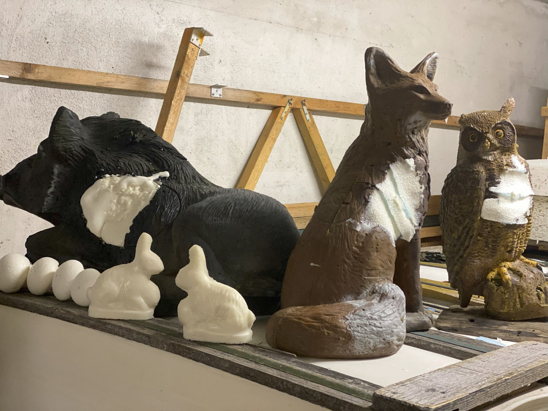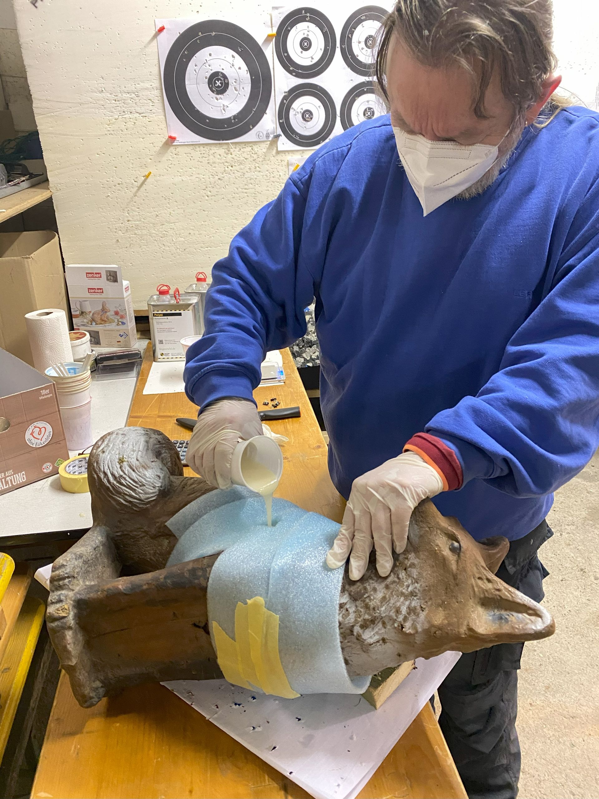 Fast schon einer Tierklinik glich der Lagerraum im Keller der Schützengilde, als dieser Tage einige unserer 3D-Tiere unters "Messer" kamen. Jahrelang hatten sie im Parcours treu und zuverlässig unzählige Pfeile gefangen. Am Schluss waren sie in den Killbereichen dann halt mürbe geworden und mussten ausgetauscht werden. Doch zum Entsorgen waren sie viel zu schade - das zumindest dachten sich die Experten - und holten sie im Herbst ins Trockene. Nach einigen Studien und Versuchen war schließlich die richtige Mischung für einen geeigneten Reparaturschaum gefunden. Doch zuvor mussten die zerschossenen Bereiche mit einem scharfen Messer herausgeschnitten werden. Übrig blieb meist eine kraterförmige Vertiefung, die vorsichtig mit einer Zwei-Komponenten-Flüssigkeit ausgegossen wurde. Da der Schaum beim Austrocknen an Volumen zunimmt, reichten meist kleine Mengen aus. Im Einzelfall musste noch etwas nachgegossen werden. Nach den ersten Durchgängen wiesen die reparierten Stellen von Wildschwein, Fuchs, Uhu und Bär die richtige Dichte auf, um Pfeile sicher zu halten und leicht wieder herausziehen zu lassen. Noch die eine oder andere Nachmodellierung und ein passender Farbanstrich, und die Gesellen sind wieder fit für den Parcours. Als Gag am Rande erwiesen sich kleine Hasen-Skulpturen, die in einer Osterhasen-Backform aus Reparaturschaum gegossen wurden. Die erste Probebemalung ist bereits im Gange und vielleicht tauchen die putzigen Langohren bald als Ostergeschenk auf.