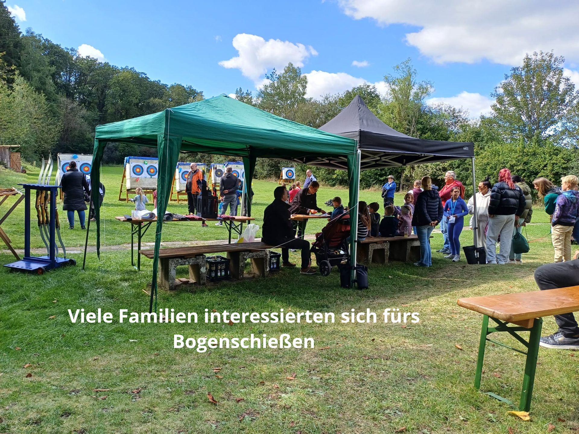 Am Nachmittag ‚brachen alle Dämme‘. Zahllose Familien strömten auf den Bogenplatz und die jungen Sportlerinnen und Sportler durften mit unseren neu erworbenen Kinderbögen auf acht Scheiben schießen. Dabei wurden sie von unseren Mitgliedern tatkräftig unterstützt: Ausgabe und Anlegen der Schutzausstattungen, Einteilung auf die Scheiben und Anleitung zum Bogenschießen – alles ging Hand in Hand und routiniert von statten, so dass die Gäste keine langen Wartezeiten hinnehmen mussten.