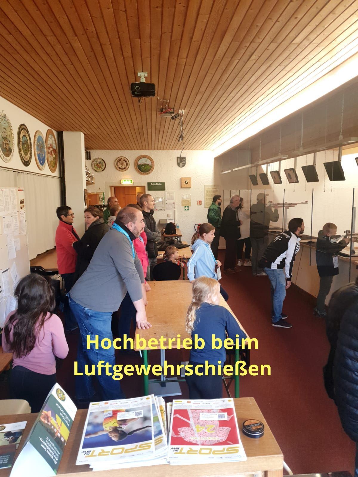 Auch in der Luftgewehrhalle herrschte Hochbetrieb. Dort durften die jungen Besucherinnen und Besucher, sofern sie bereits das zwölfte Lebensjahr absolviert hatten, mit den Luftgewehren schießen. Für jüngere standen zwei ‚Lichtgewehre‘ bereit, die das selbe Schießerlebnis boten, aber für Kinder zugelassen sind. Fachkundig wurden sie von den Mitgliedern der Schützenabteilung beraten, wie das kleine 4-Millimeter-Kügelchen auf 10 Meter Entfernung in die Mitte der kleinen Zielscheibe zu bugsieren sei. Für die besten Treffer gab es kleine Tütchen mit Gummibären.
