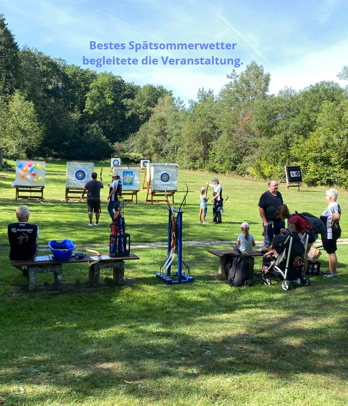 Kaum war die Eröffnungsansprache von Bürgermeister Philipp Hahn im Weiherstadion vorüber, strömten die ersten Familien zur Schützengilde Hechingen. Bei bestem Sommerwetter erwartete sie ein aufregendes Programm rund um den Schießsport. Die Gilde hatte sich auf den großen Andrang vorbereitet: In der Luftgewehrhalle lagen Wettkampf- und Lichtgewehre bereit, während auf dem Bogenplatz die passenden Ausrüstungen für das Bogenschießen bereitstanden. Den ganzen Tag über wurden die Stationen intensiv genutzt. Zahlreiche engagierte Helferinnen und Helfer kümmerten sich um die Gäste, gaben Anleitungen und sorgten für einen reibungslosen Ablauf. Ein besonderes Highlight war die Unterstützung durch Fiona und Finn, zwei junge Mitglieder der neu gegründeten Kinder- & Jugendsparte, die den jüngsten Besuchern mit Begeisterung das richtige Schießen beibrachten.