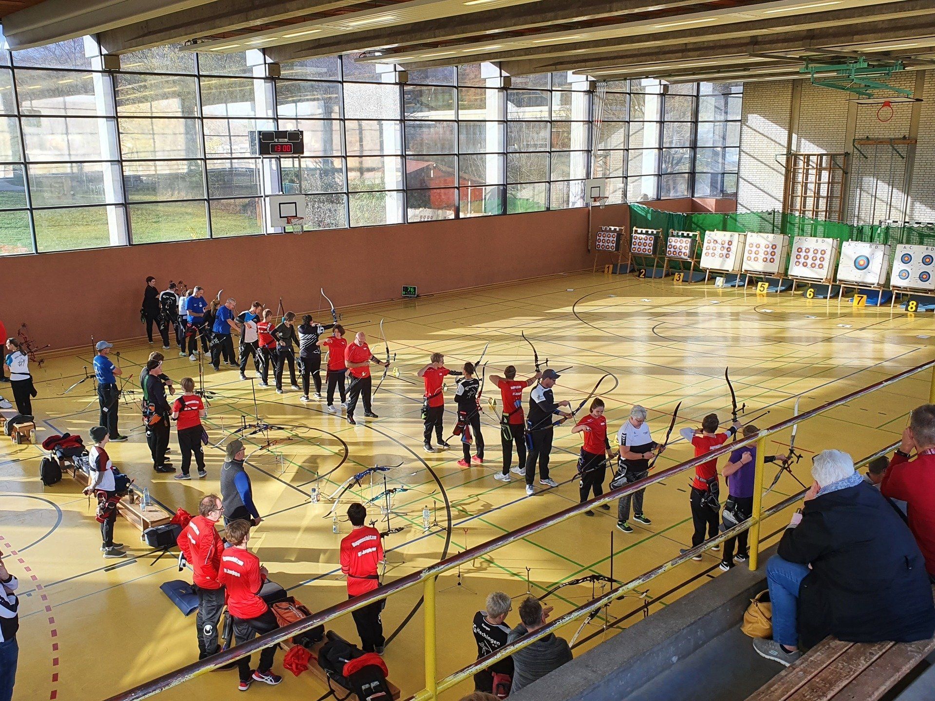 Es gab schon mehr Gedränge in der Realaschulhalle in Hechingen. Erstmals seit dem Jahr 2019 hatte der Schützenkreis Zollernalb wieder zur Meisterschaft der Bogenschützen eingeladen, nachdem in den beiden Vorjahren die Wettkämpfe wegen der Corona-Pandemie abgesagt worden waren. Der Ausschreibung waren insgesamt 43 Bogensportlerinnen und Bogensportler gefolgt und die Schützengilde Hechingen hatte in bewährter Weise alle Vorbereitungen getroffen. Die am häufigsten vertretenen Wettkampfklassen waren Recurve Herren, Recurve Master männlich und Recurve Jugend männlich mit jeweils sieben Teilnehmern. Hinzu gesellten sich ssechs Damen mit Recurvebögen. Bei den Blankbögen traten jeweils drei Herren und drei Damen an. Ansonsten nahmen in vielen anderen Klassen die Schützen nur paarweise oder einzeln teil. Die Siegerehrungen wurden vom Kreisbogenreferenten Harald Schäfer vorgenommen. Die Ergebnisse sind hier nachzulesen.