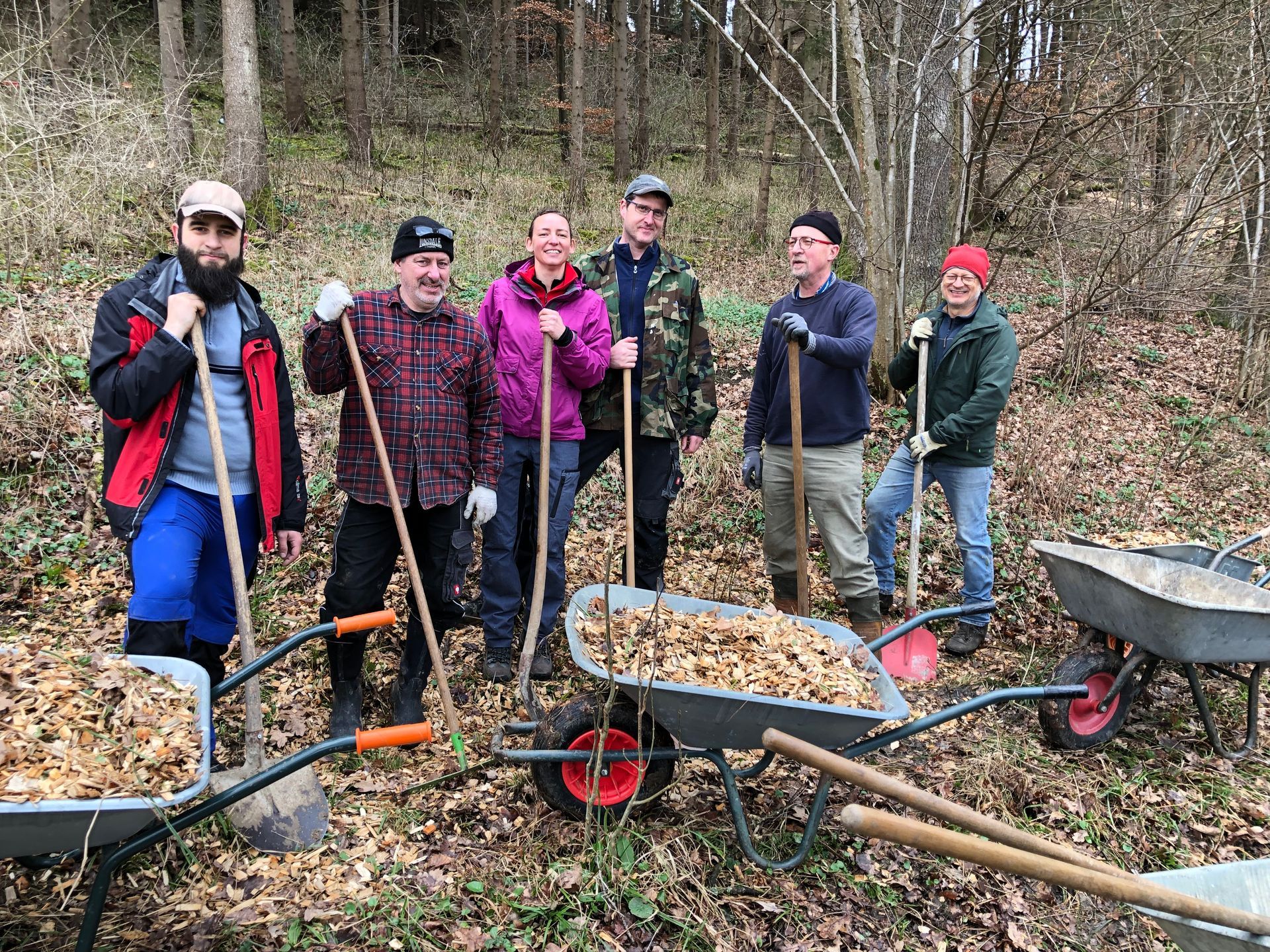 Mehr Sicherheit beim Parcours-Rundgang, dieses Ziel hatte der Arbeitseinsatz am Samstag, dem 25. März 2023. Viele Freunde des jagdlichen Bogenschschießens genießen die Rundgänge durch unseren vereinseigenen 3D-Parcours beim Schützenhaus. Doch gleichzeitig müssen sie sich vor allerlei Gefahren in Acht nehmen. Sei es Ausrutschen an steilen und matschigen Stellen, Stolpern an ausgetretenen Geländestufen oder auch nur vermeidbare Verschmutzung von Schuhen und Kleidung. Diese Widrigkeiten hatte unser Parcours-Wart erkannt und Planungen zur Abhilfe getroffen. Zunächst wurde der Pfad an den 'neuralgischen' Stellen trassiert, d.h. mit Ästen und dünnen Baumstämmen markiert. Dann galt es, an den steilen Auf- und Abstiegen Stufen aus Rundhölzern anzubringen. Im letzten Abschnitt wurde nun unter Mithilfe mehrerer Bogenschützen der 'Belag' aufgebracht. Natürlich in Form von ökologischen, zertifizierten Fallschutz-Holzhackschnitzeln. Die Mühen wurden mit einem deftigen Vesper belohnt und beim ersten Probedurchgang zeigte sich sogleich die deutlich verbesserte Trittsicherheit. Somit steht dem Training mit Pfeil und Bogen und der Erholung auf dem schönen Wald-Rundweg nichts mehr entgegen.