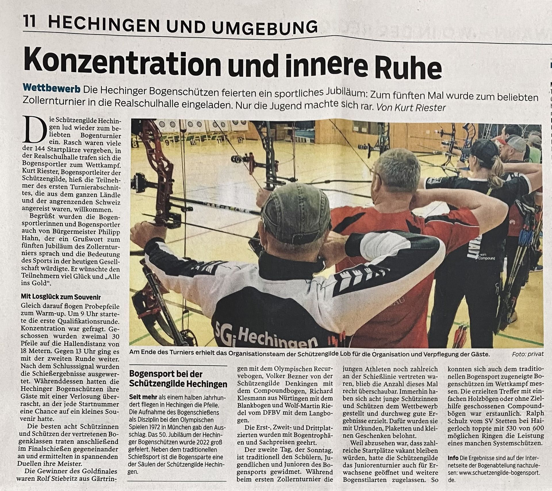 Am vergangenen Wochenende verwandelte sich die Sporthalle der Realschule in Hechingen zum siebten Mal in Folge in das Wettkampfzentrum für Bogensportler aus Nah und Fern: Die Schützengilde Hechingen richtete das beliebte Zollernturnier aus. Insgesamt nahmen 134 Bogenschützinnen und Bogenschützen an dem Hallenturnier teil. Hauptturnier am Samstag Der Samstag stand im Zeichen des Hauptturniers für die erwachsenen Schützen. In zwei Qualifikationsrunden lieferten sich die Teilnehmer spannende Duelle in den Bogenklassen Compound, Recurve, Blankbogen und Langbogen. Die jeweils acht Besten jeder Klasse sicherten sich einen Platz in den Finalrunden. Die Hechinger Schützengilde war dabei besonders erfolgreich: Richard Kos, Reinhold Nemitz und Kurt Riester kämpften sich bis ins Gold- und Bronzefinale vor. Darüber hinaus glänzten Hechinger Schützen im Gesamtklassement: Reiner Obst, Sandra Göhring, Reinhold Nemitz und Ralph Schulz belegten jeweils erste Plätze in ihren Bogenklassen. Erfreuliche Wende beim Jugendturnier am Sonntag Das ursprünglich als Kinder- und Jugendturnier konzipierte Sportereignis am Sonntag wurde nach längerer Flaute seinem Namen endlich wieder gerecht. Erfreulicherweise zeigten 15 Schülerinnen und Schüler sowie zwei Sportler der Altersklassen Junioren und Jugend ihr Können und sorgten damit für einen vielversprechenden Nachwuchstag im Bogensport.